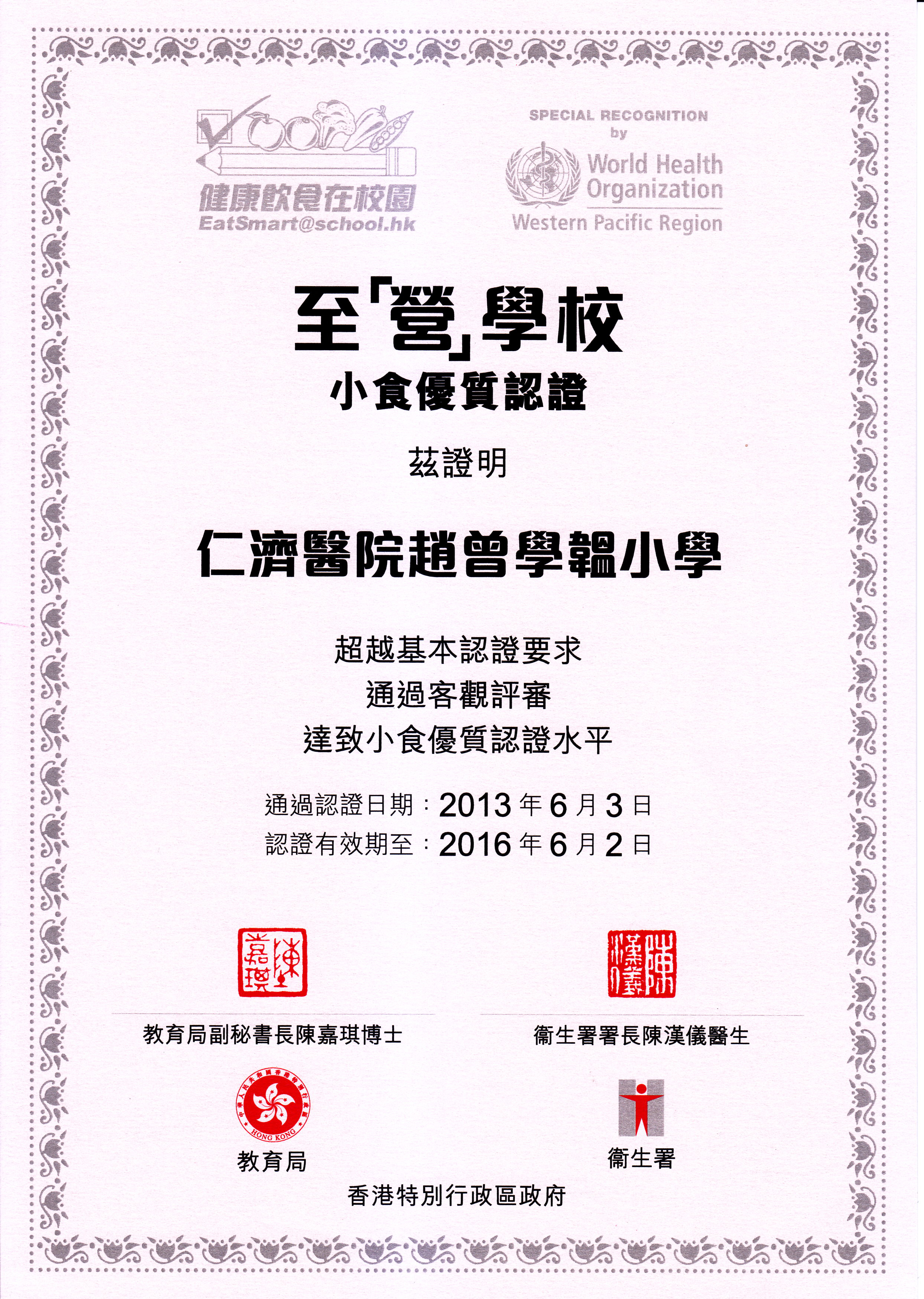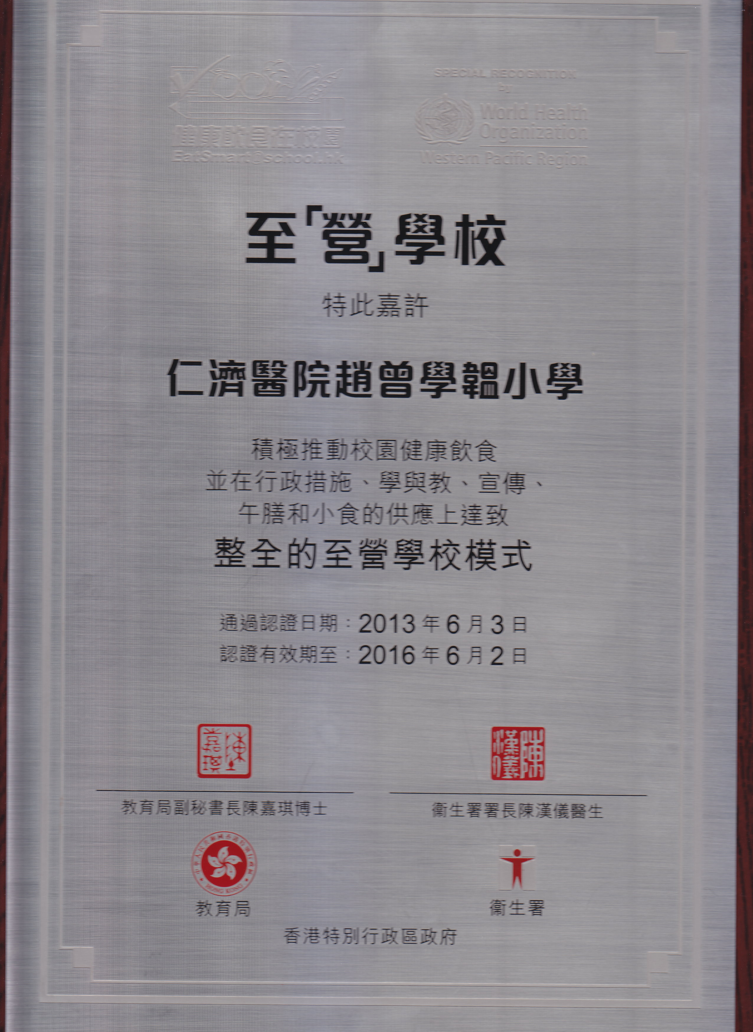 現在本校獲衞生署通知,已成功取得「至『營』學校認證」計劃的「基本認證」、「健康午膳優質認證」及「健康小食優質認證」的資格。除了獲嘉許為「至『營』學校」,並獲頒贈獎項,以表揚學校竭力推動健康飲食的努力。