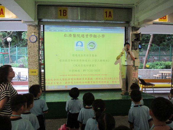 為了讓全校學生知道太陽能發電設備已在本校安家落戶,並推廣再生能源及可持續發展的觀念,於10月6日一個陽光煦煦的日子,全校學生一起參加「太陽能發電講座」,聆聽太陽光伏發電的原理、應用及其效益,並使學生明瞭實踐可持續發展觀念的重要性。