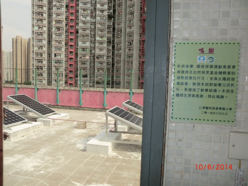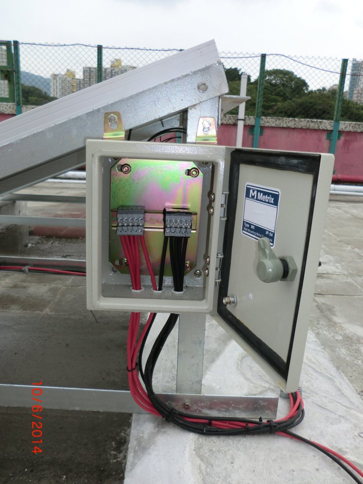 是項發電設備是要有實用性,同時又不應因供電器材的穩定性與否,最終造成學生上課的不便。因此,直接對課室供電便不是一個可以考慮的選項;至於對樓梯、走廊等照明設備的供電,因這些位置的照明並不經常使用,容易做成發電設備的閒置。為配合校舍人流及照明的最大化使用,故最終擬定由太陽能所產生的電源提供給校舍四樓男廁的兩套合共四支光管使用。