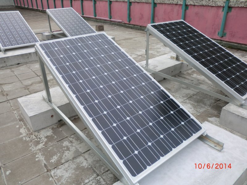 ![]() 四塊太陽能板的接線器,合四為一,紅色為直流電正極,黑色為負極。 |