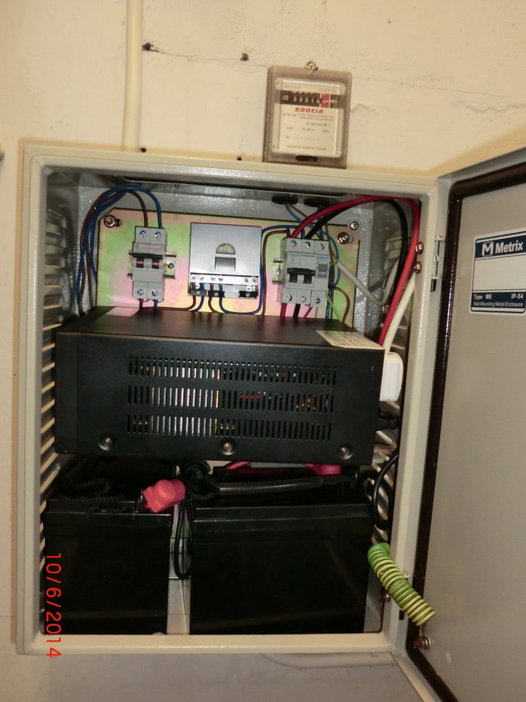 ![]() 打開電箱,經中間的轉換器,把由天台引至的直流電變為交流電,下方兩個為儲電池,優先接受太陽能電力充電,不足夠時才交由市電為儲電池充電,這過程由電箱內上方的控制器指揮。
